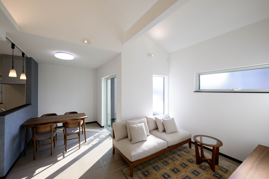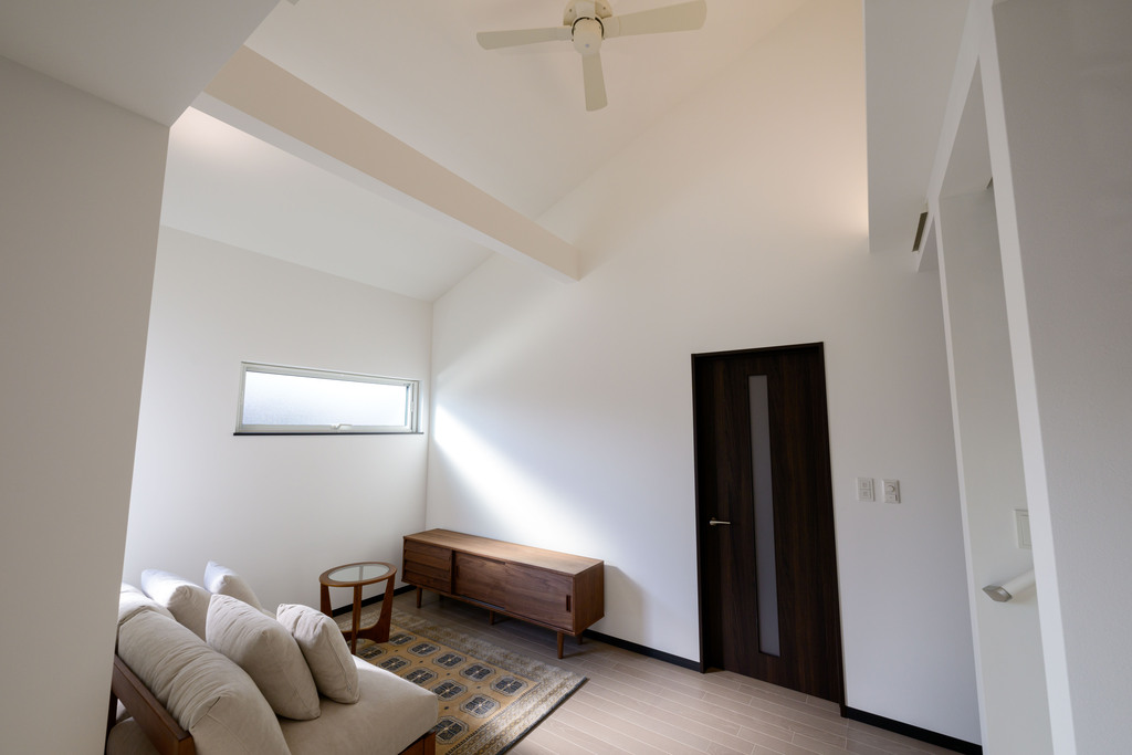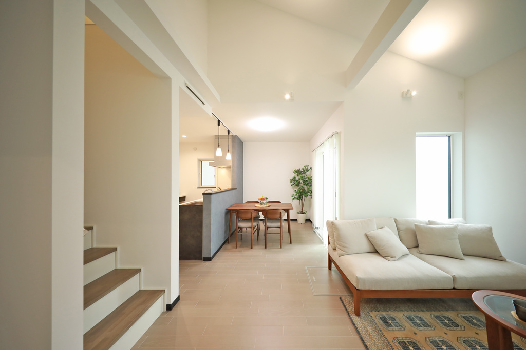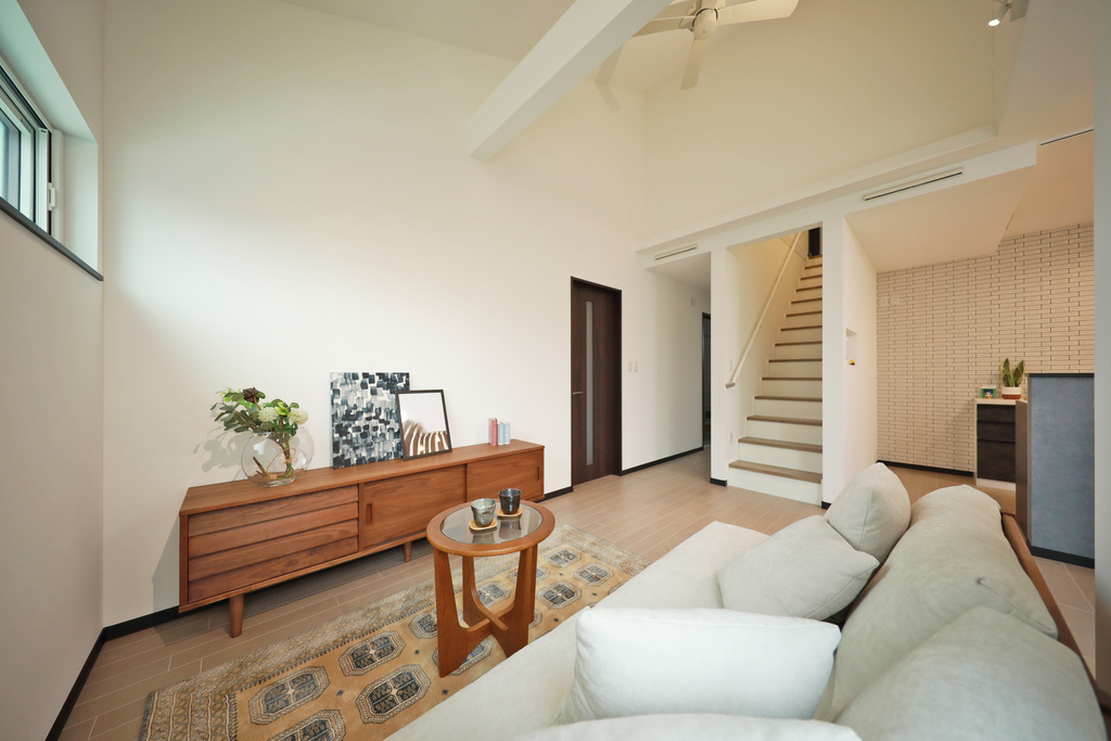 高く伸びる勾配天井が、空間にゆとりと開放感を与えるリビング。