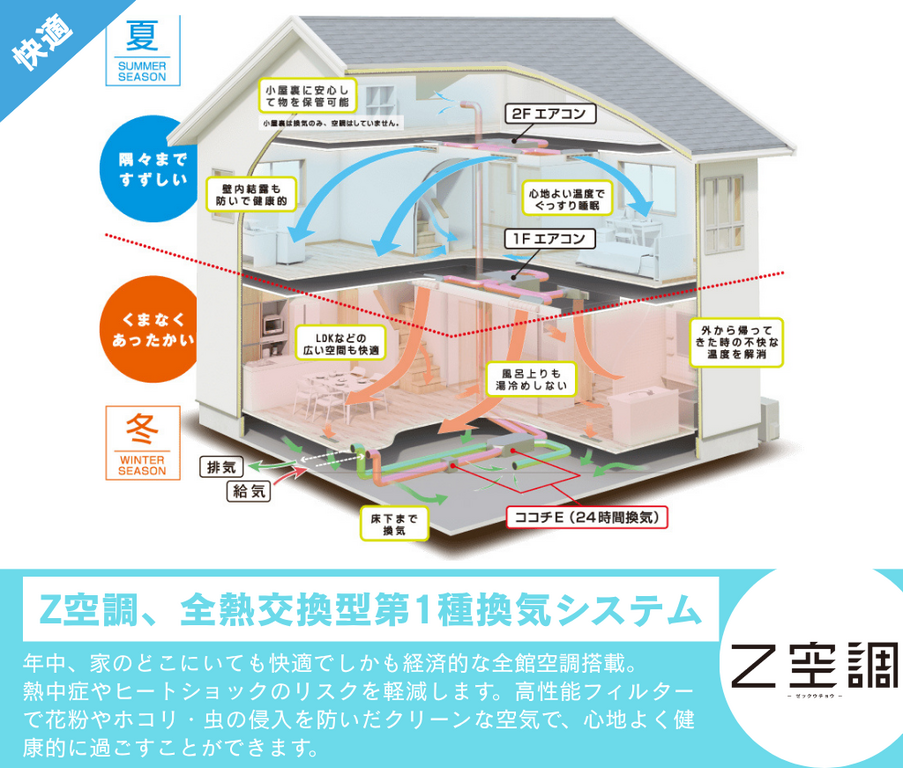 従来の部屋ごとにエアコンを設置する方式とは異なり、家全体を均一な温度にするため、廊下や洗面所など非居室も快適になります。