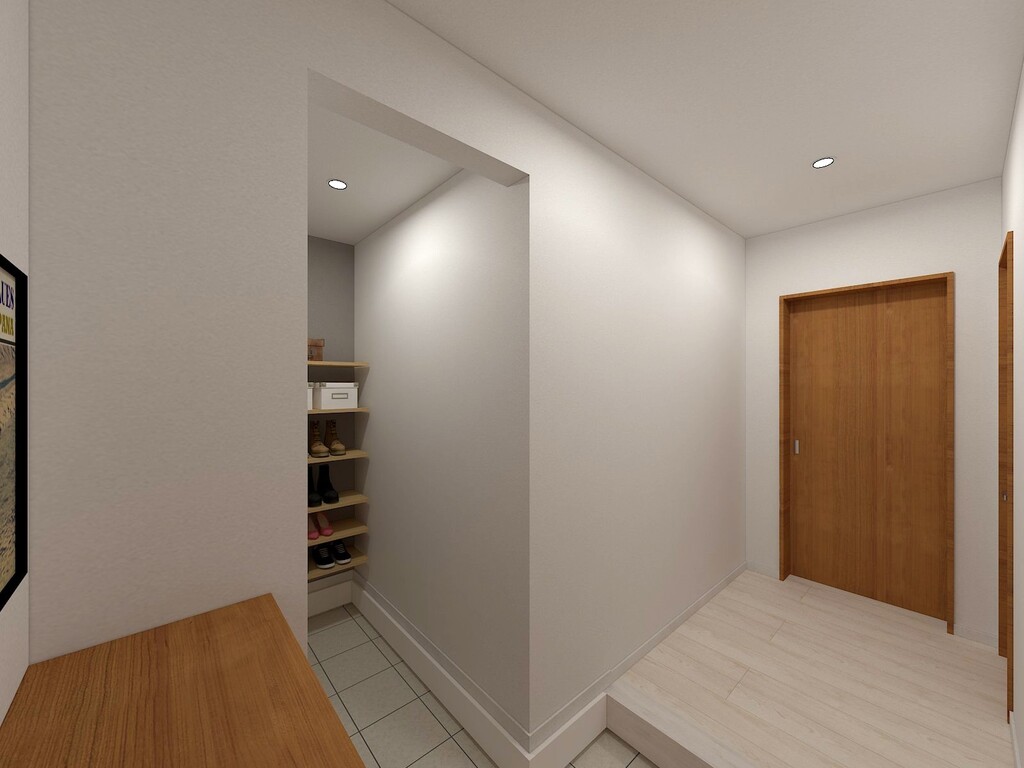 玄関には家族全員の靴やアウトドア用品がしまえるシューズクローク、キッチンには食材や家電をまとめて収納できるパントリー、主寝室には大容量のウォークインクローゼットを完備。