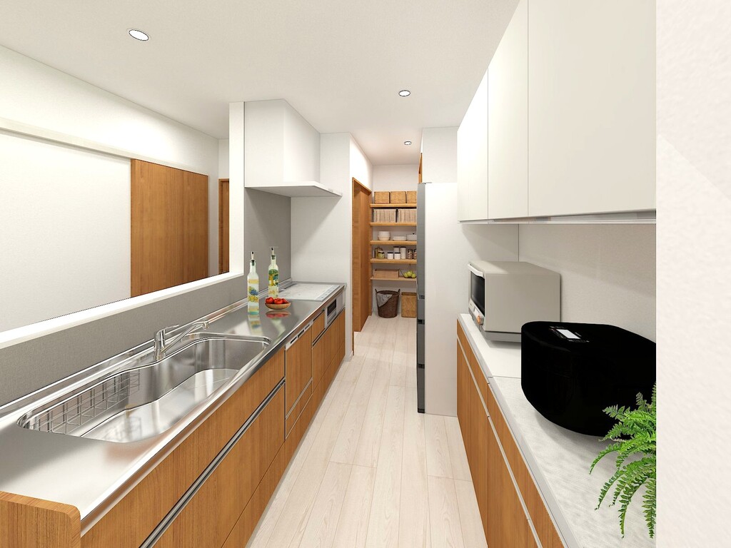 玄関からキッチン・リビングへとスムーズにつながる回遊動線を採用。買い物帰りの荷物運びや、忙しい朝の身支度もスムーズです。さらに洗面や水まわりへのアクセスも良く、毎日の家事がぐっとラクになります