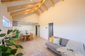 あえて2階に設けたLDK。2階ならではの屋根形状を生かした勾配天井が生み出す空間の広さとインパクトのある見た目、そして開けた眺望は住まう人に高揚感と満足感を与えます。