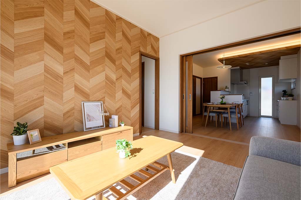 日当たりのよいリビングスペースにはアクセントクロスを、また同居のご家族とのコミュニケーションをとりやすいようリビングに隣接する洋室を作りました。収納も〇。