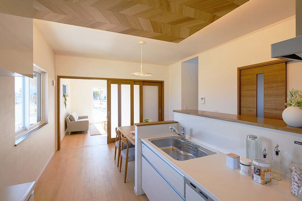 カウンター型のキッチンの天井には間接照明を設置しました。雰囲気のあるダイニングキッチンスペースです。背面にはカップボード、駐車場側には勝手口もあるので、買い物などの荷物の出し入れも楽々です。