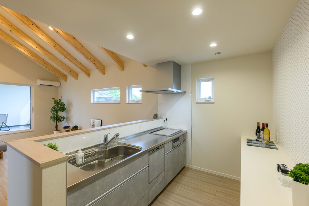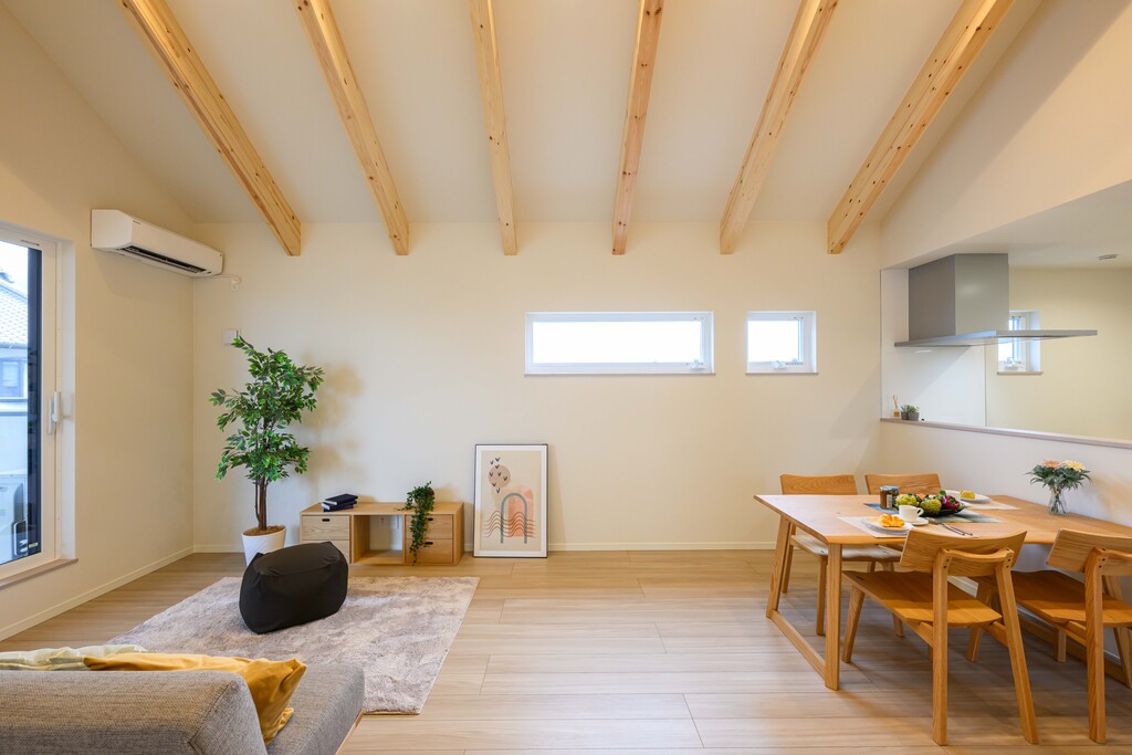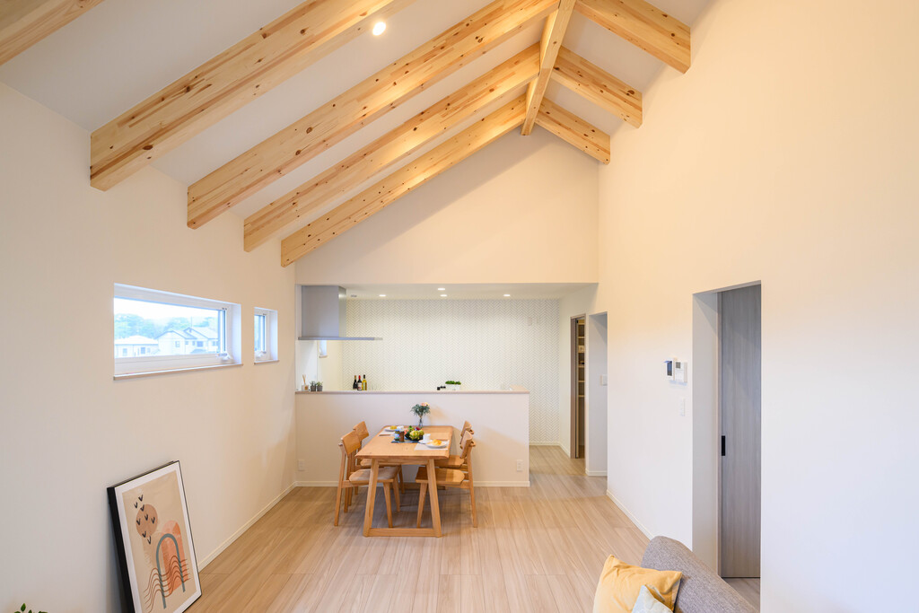 2階ならではの屋根形状を生かした勾配天井が生み出す空間の広さとインパクトのある見た目、そして開けた眺望は住まう人に高揚感と満足感を与えます。