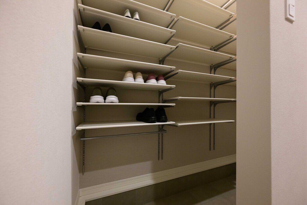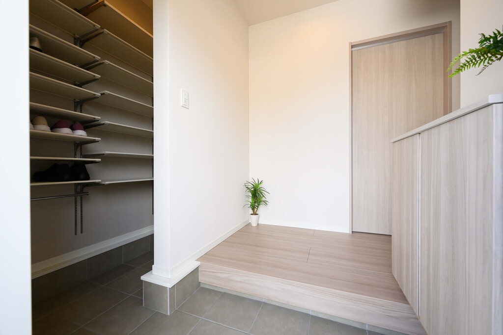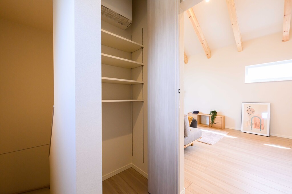 皆様が欲しがるシューズクローク、パントリー、ランドリールーム、ウォークインクローゼットだけでなく、各階廊下にも大きな収納を配置。人が動く線上にあることで効率的な生活を送れます。